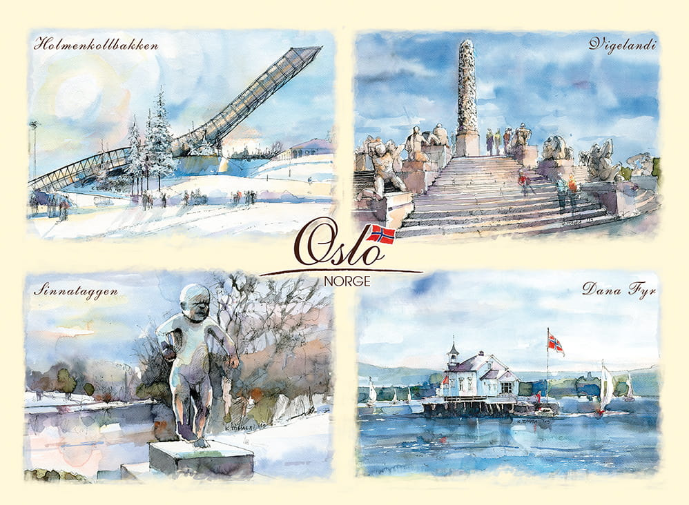 Przedstawia artystyczny obraz najciekawszych widoków i zakątków Oslo,