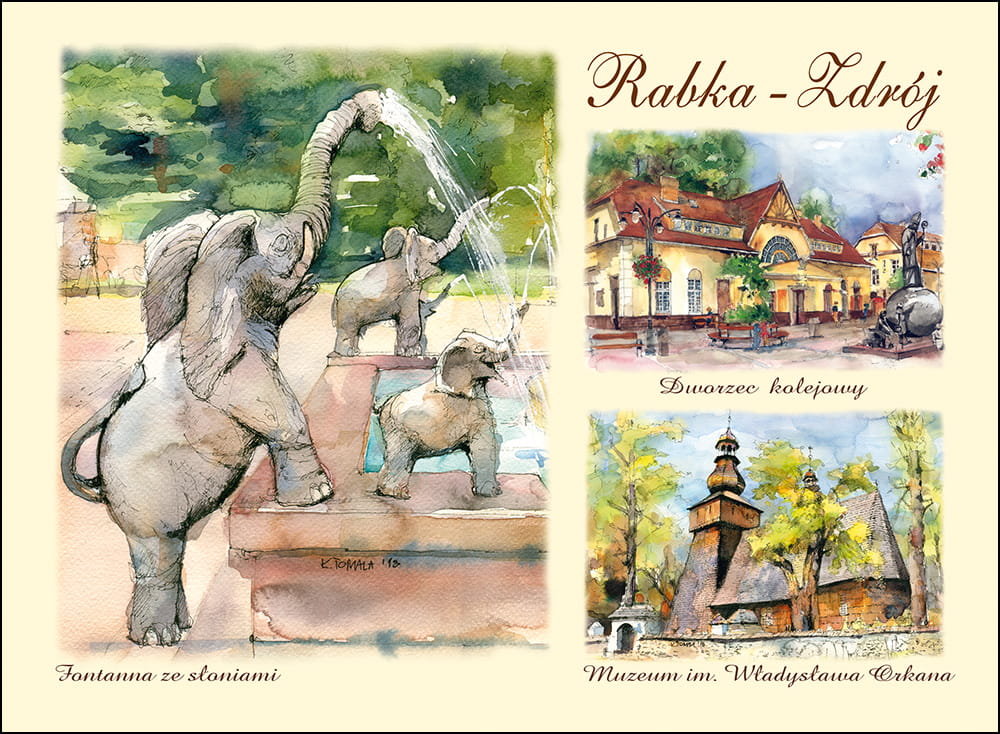 Przedstawia artystyczny obraz najciekawszych widoków i zakątków Rabki Zdrój,