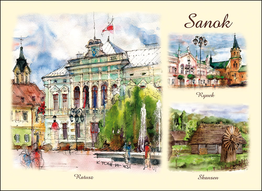 Przedstawia artystyczny obraz najciekawszych widoków i zakątków Sanoka,