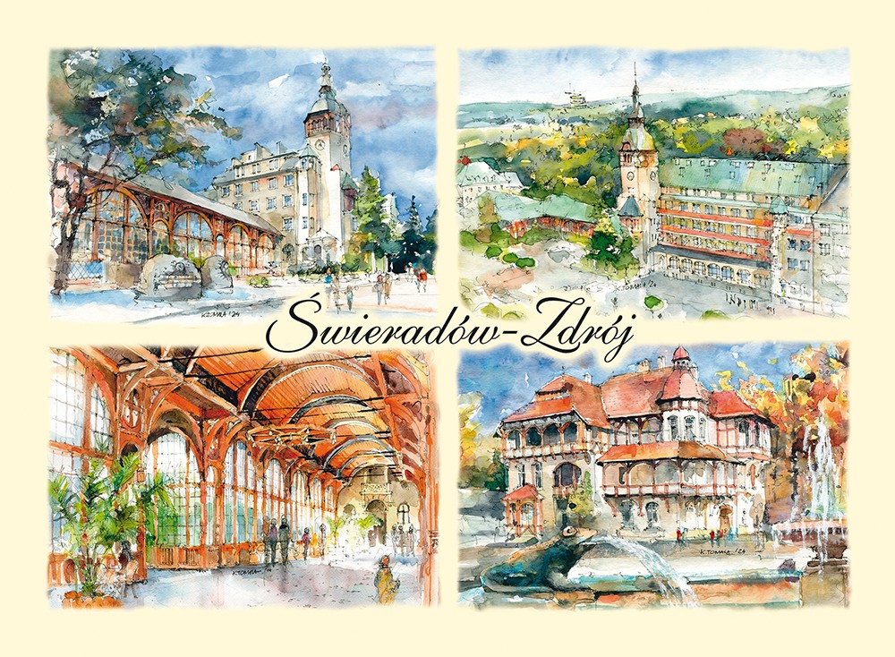 Przedstawia artystyczny obraz najciekawszych widoków i zakątków Świeradowa Zdroju,