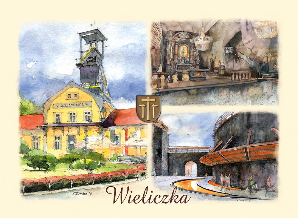 Przedstawia artystyczny obraz najciekawszych widoków i zakątków Wieliczki,