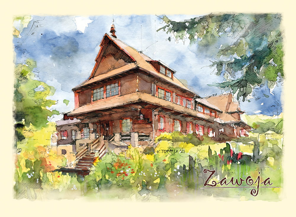 Przedstawia artystyczny obraz siedziby Babiogórskiego Parku Narodowego.