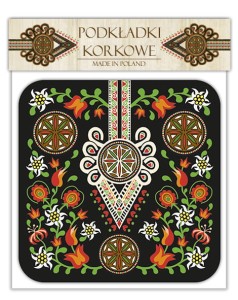 Komplet 2 sztuk podkładek pod kubek z wzornictwem opartym na tradycyjnych wzorach ludowych, opracowany przez wydawnictwo „Czwórka” na bazie motywów podhalańskiej kultury ludowej.