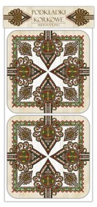 Komplet 4 sztuk podkładek pod kubek z wzornictwem opartym na tradycyjnych wzorach ludowych, opracowany przez wydawnictwo „Czwórka” na bazie motywów podhalańskiej kultury ludowej.