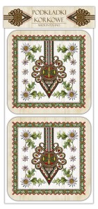 Komplet 4 sztuk podkładek pod kubek z wzornictwem opartym na tradycyjnych wzorach ludowych, opracowany przez wydawnictwo „Czwórka” na bazie motywów podhalańskiej kultury ludowej.