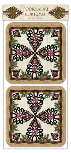 Komplet 4 sztuk podkładek pod kubek z wzornictwem opartym na tradycyjnych wzorach ludowych, opracowany przez wydawnictwo „Czwórka” na bazie motywów podhalańskiej kultury ludowej.