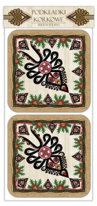Komplet 4 sztuk podkładek pod kubek z wzornictwem opartym na tradycyjnych wzorach ludowych, opracowany przez wydawnictwo „Czwórka” na bazie motywów podhalańskiej kultury ludowej.