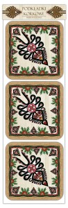 Komplet 6 sztuk podkładek pod kubek z wzornictwem opartym na tradycyjnych wzorach ludowych, opracowany przez wydawnictwo „Czwórka” na bazie motywów podhalańskiej kultury ludowej.
