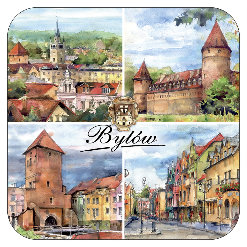Wzór opracowany przez wydawnictwo "Czwórka" na podstawie obrazów akwarelowych tworzonych na nasz wyłączny użytek przez p.Katarzynę Tomalę. Przedstawia artystyczny obraz najciekawszych obiektów miasta Bytów.
