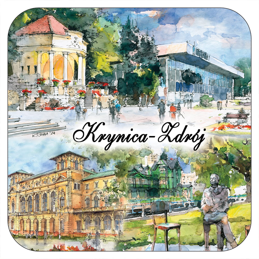 Wzór opracowany przez wydawnictwo "Czwórka" na podstawie obrazów akwarelowych tworzonych na nasz wyłączny użytek przez p.Katarzynę Tomalę. Przedstawia artystyczny obraz najciekawszych obiektów Krynicy Zdroju.