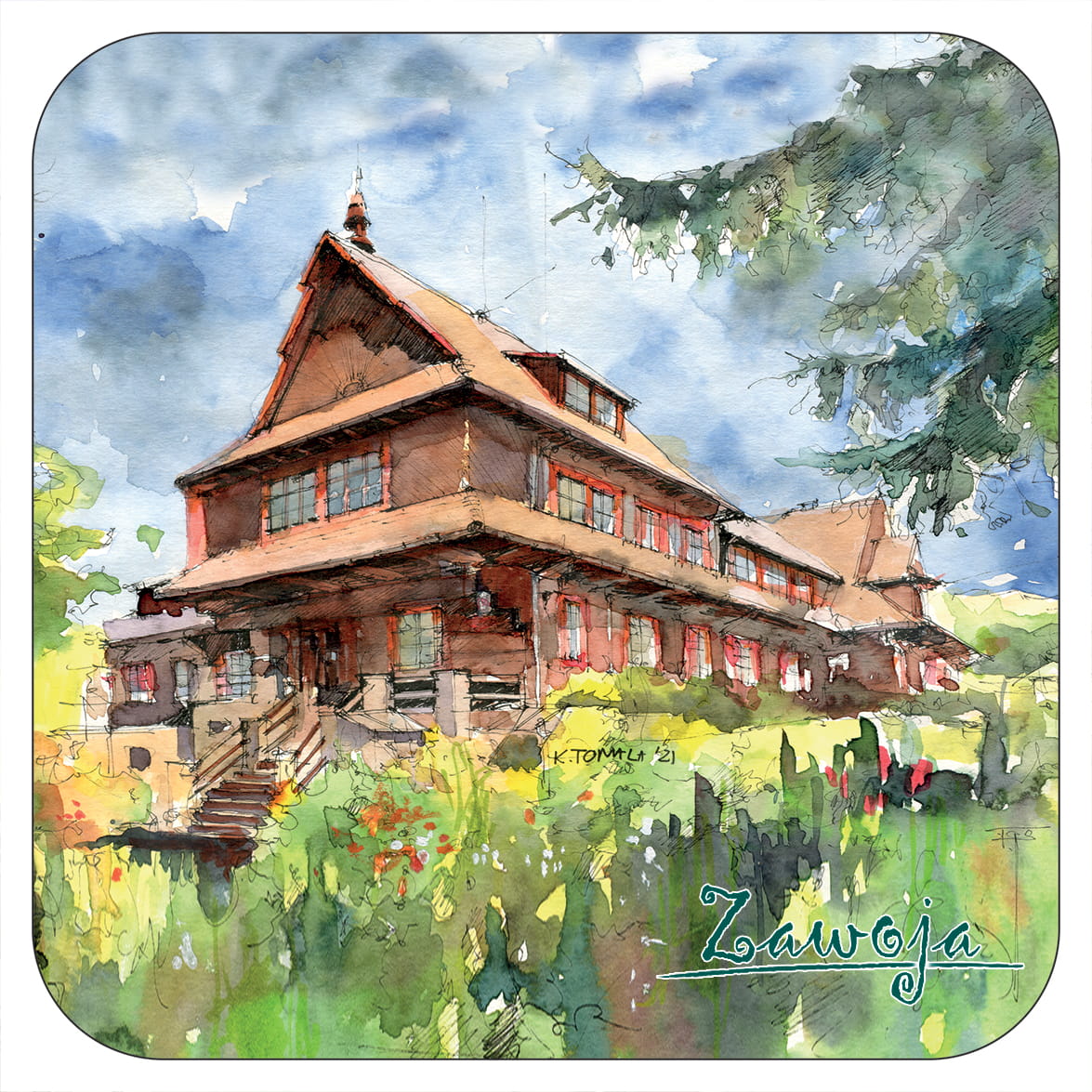 Wzór opracowany przez wydawnictwo "Czwórka" na podstawie obrazów akwarelowych tworzonych na nasz wyłączny użytek przez p. Katarzynę Tomalę. Przedstawia artystyczny obraz siedziby Babiogórskiego Parku Narodowego w Zawoi.