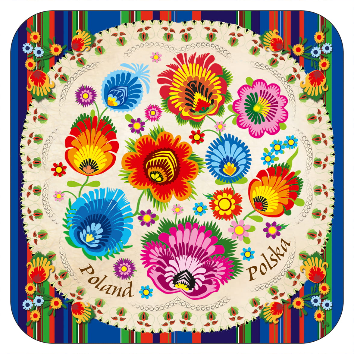 Wzór oparty na tradycyjnej polskiej twórczości ludowej z okolic Łowicza, opracowany przez wydawnictwo „Czwórka” na bazie prac artystki ludowej pani Mirosławy Stefaniak.