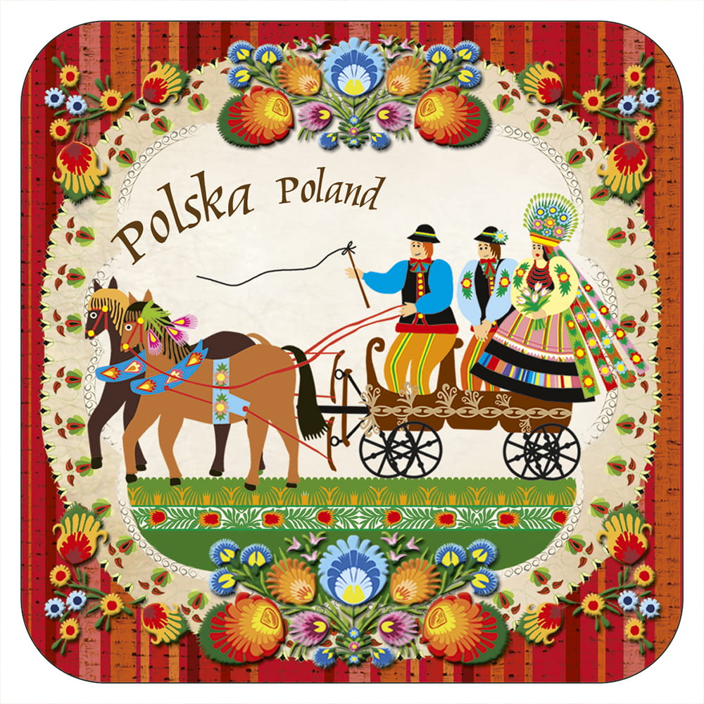 Wzór oparty na tradycyjnej polskiej twórczości ludowej z okolic Łowicza, opracowany przez wydawnictwo „Czwórka” na bazie prac artystki ludowej pani Mirosławy Stefaniak.