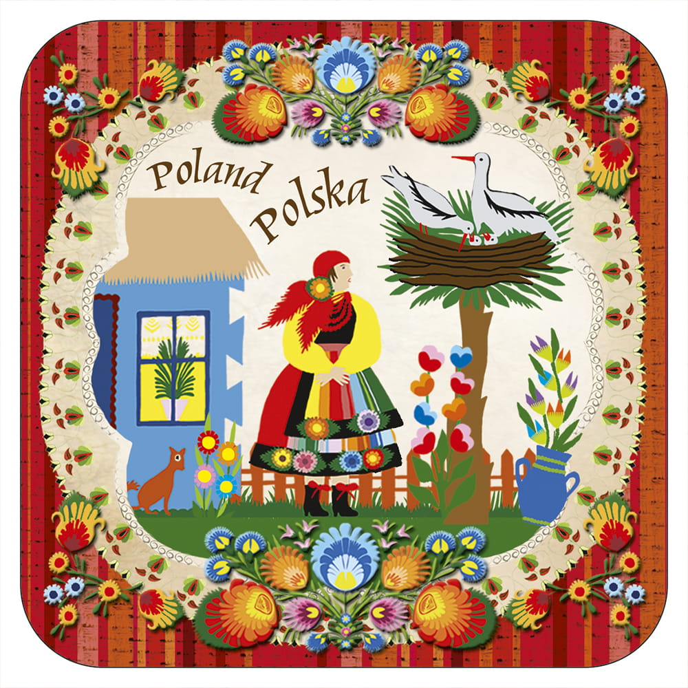 Wzór oparty na tradycyjnej polskiej twórczości ludowej z okolic Łowicza, opracowany przez wydawnictwo „Czwórka” na bazie prac artystki ludowej pani Mirosławy Stefaniak.
