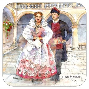 Wzór opracowany przez wydawnictwo "Czwórka" na podstawie akwareli autorstwa p.Katarzyny Tomali przedstawiający parę w ludowym stroju żywieckim na tle dziedińca żywieckiego zamku.