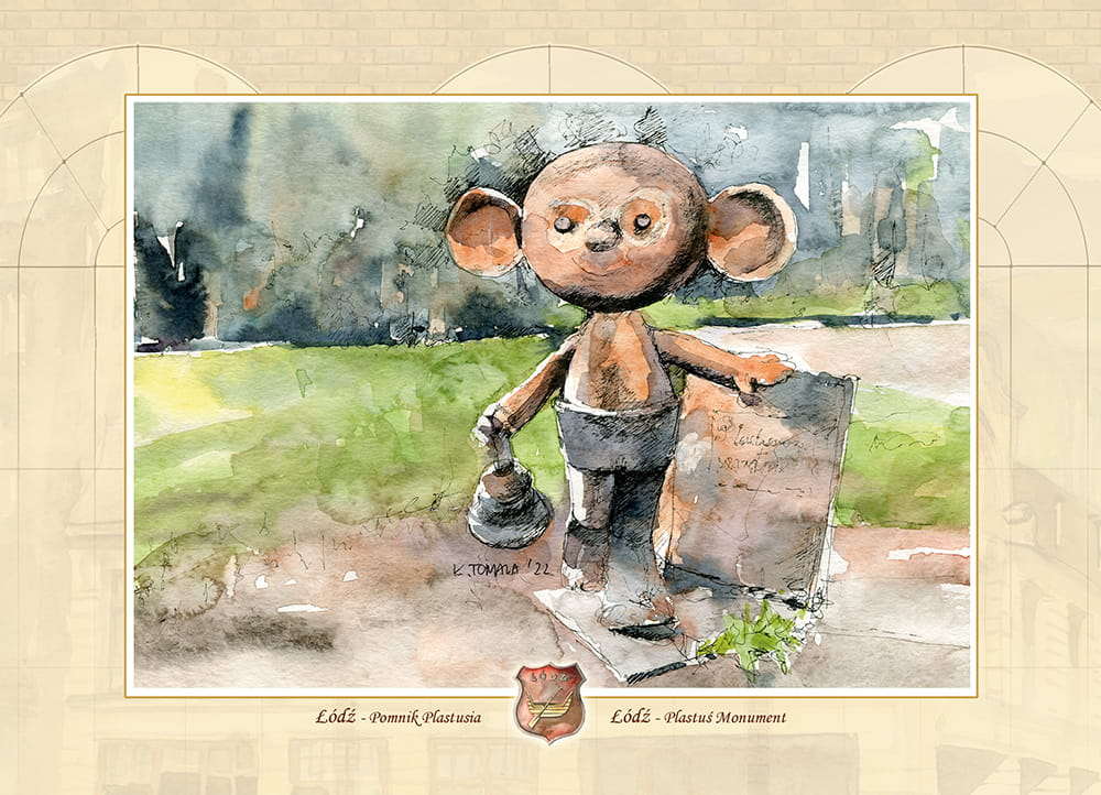 Przedstawia pomnik Plastusia w Łodzi.