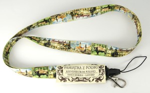 Zakończona metalowym karabińczykiem i plastikową szybkozłączką do np. telefonu komórkowego.