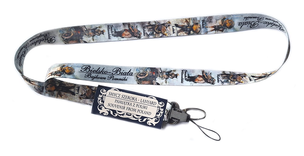 Zakończona metalowym karabińczykiem i plastikową szybkozłączką do np. telefonu komórkowego.