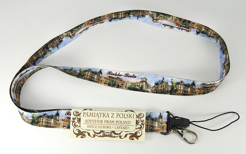 Zakończona metalowym karabińczykiem i plastikową szybkozłączką do np. telefonu komórkowego.