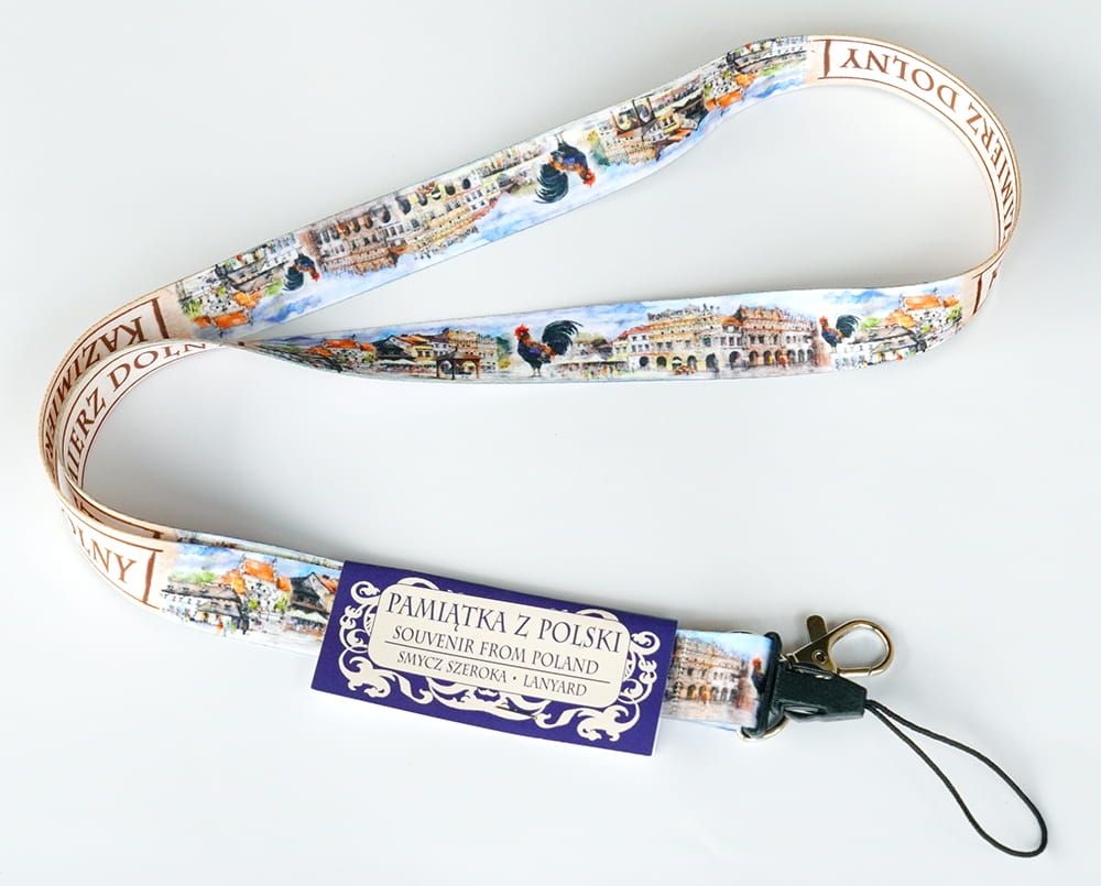 Zakończona metalowym karabińczykiem i plastikową szybkozłączką do np. telefonu komórkowego.