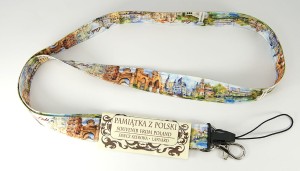 Zakończona metalowym karabińczykiem i plastikową szybkozłączką do np. telefonu komórkowego.