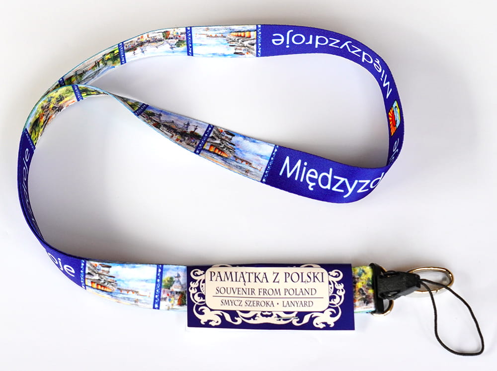 Zakończona metalowym karabińczykiem i plastikową szybkozłączką do np. telefonu komórkowego.