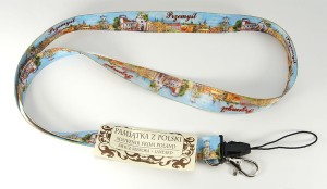 Zakończona metalowym karabińczykiem i plastikową szybkozłączką do np. telefonu komórkowego.