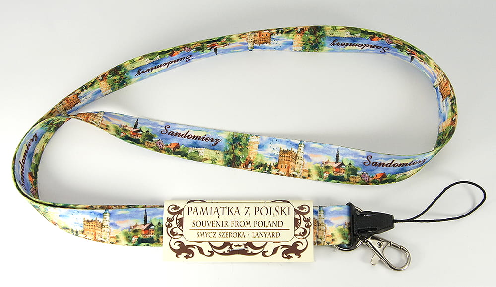 Zakończona metalowym karabińczykiem i plastikową szybkozłączką do np. telefonu komórkowego.