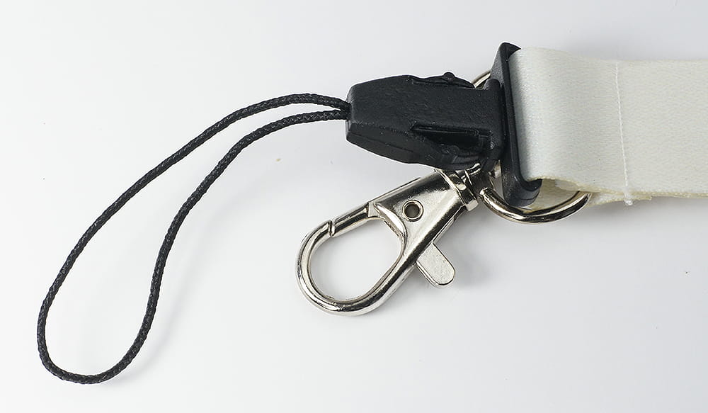 Zakończona metalowym karabińczykiem i plastikową szybkozłączką do np. telefonu komórkowego.