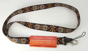 Zakończona metalowym karabińczykiem i plastikową szybkozłączką do np. telefonu komórkowego.