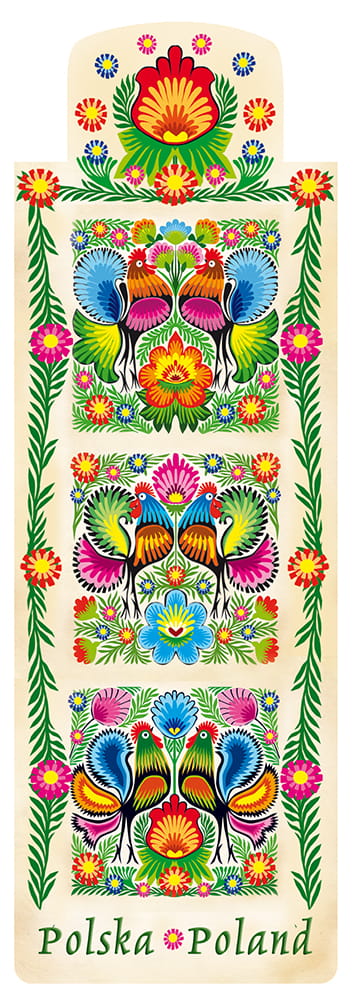 Wzór oparty na tradycyjnej polskiej twórczości ludowej z okolic Łowicza, opracowany przez wydawnictwo "Czwórka" na bazie prac artystki ludowej p.Mirosławy Stefaniak.