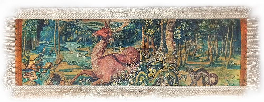 Wykorzystano fragmenty arrasu krajobrazowo - zwierzęcego - Leżący daniel, ssak drapieżny i kaczor.